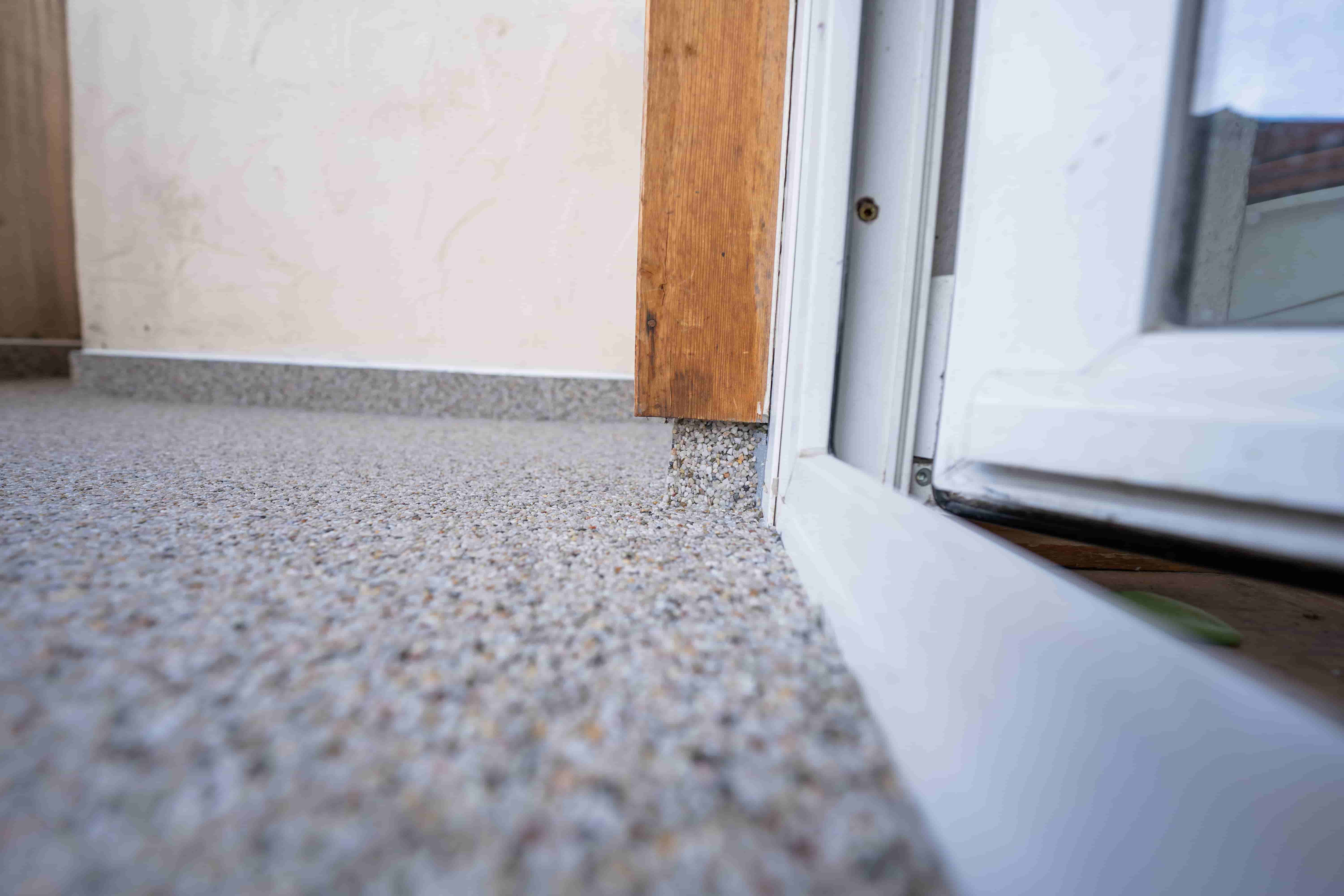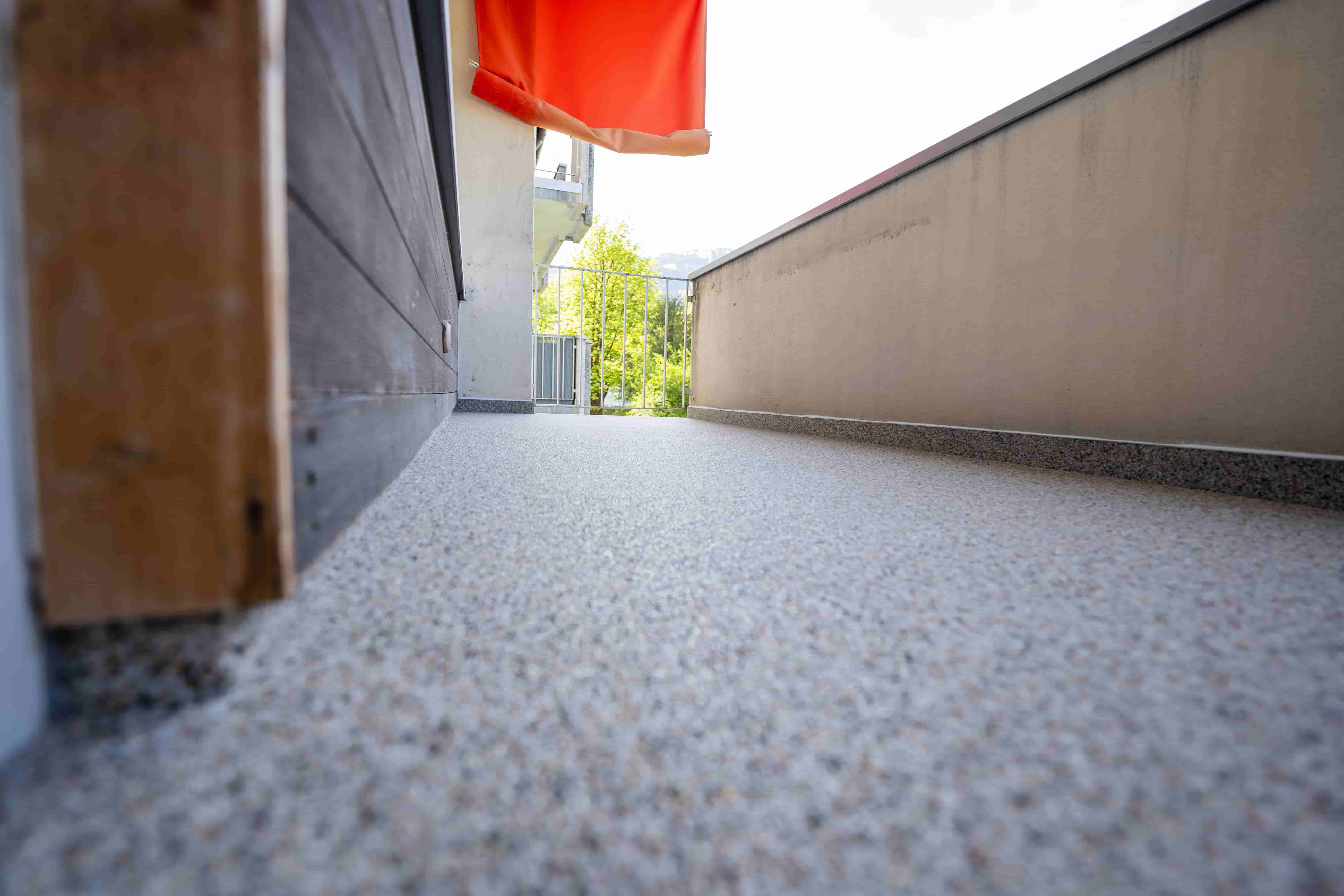 - Der Belag: Als finale Nutzschicht wurde ein hoch belastbarer Steinchenteppich aufgebracht. Er ist extrem abriebfest, UV-beständig und bietet den Bewohnern ein angenehmes Barfußgefühl.