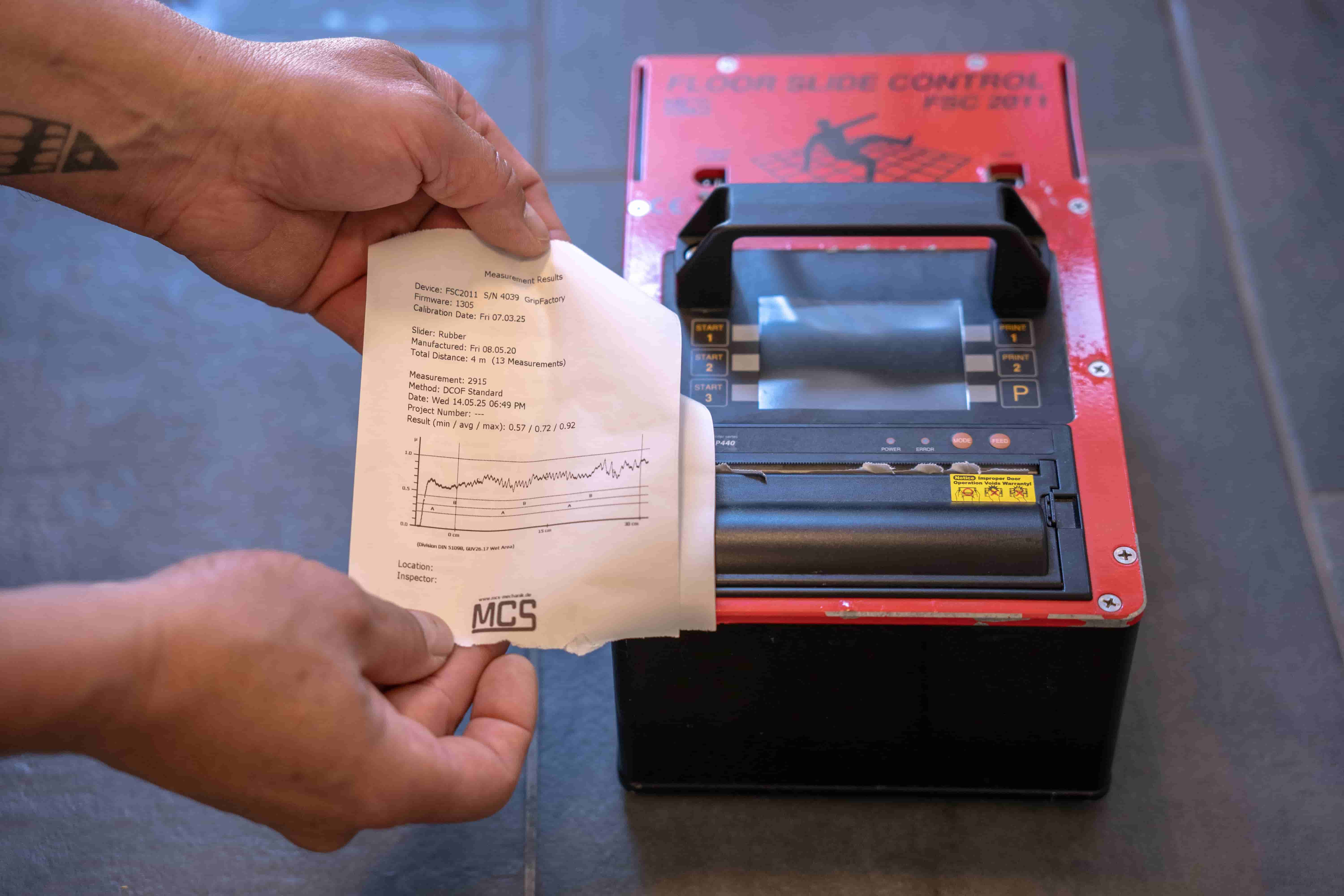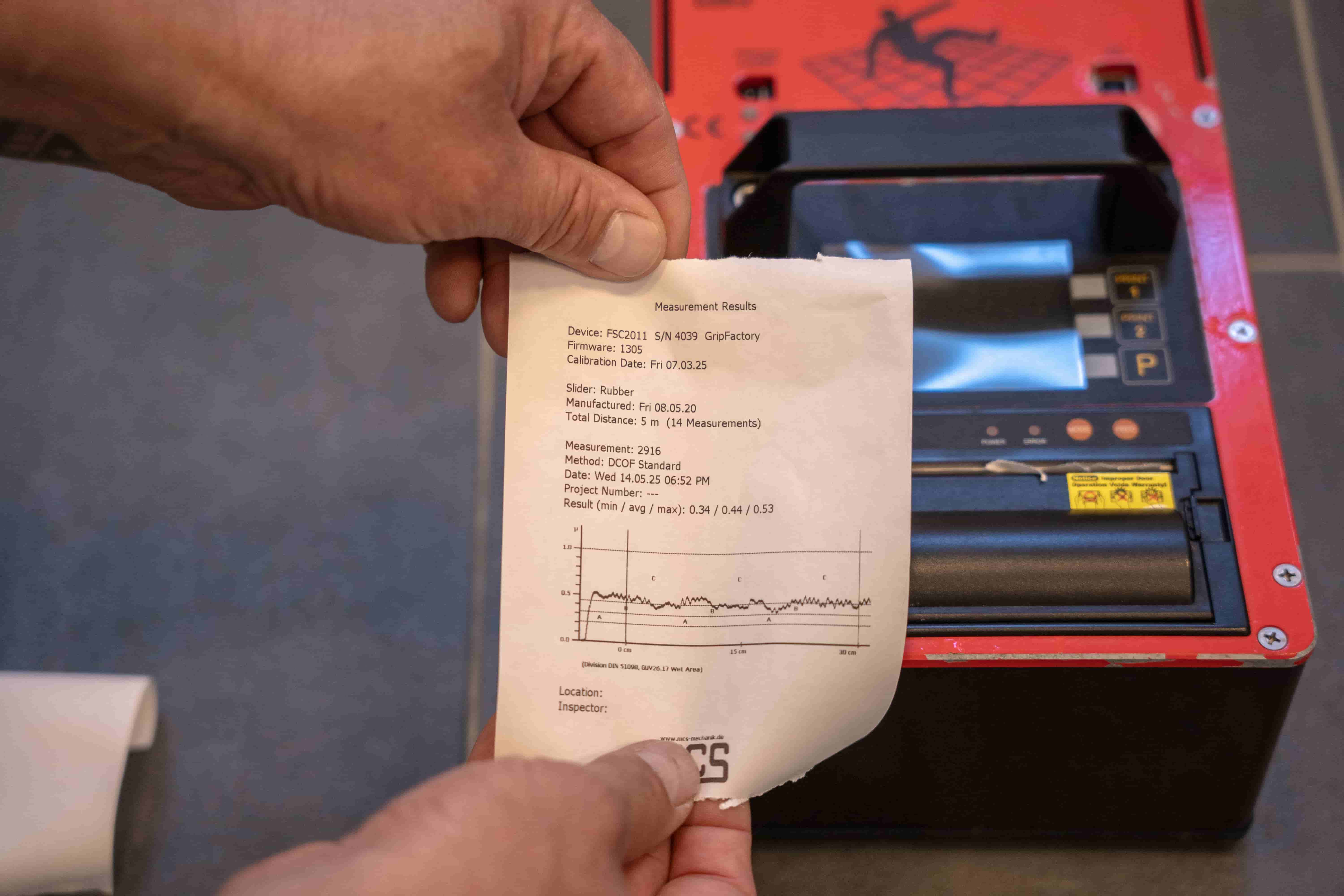 - Objektiver Nachweis: Um die Rechtssicherheit für den Betreiber zu gewährleisten, wurde vor und nach der Behandlung eine offizielle Gleitreibungsmessung mit einem zugelassenen Messgerät durchgeführt. Der Vorher-Nachher-Vergleich dokumentiert schwarz auf weiß die drastische Steigerung der Trittsicherheit.