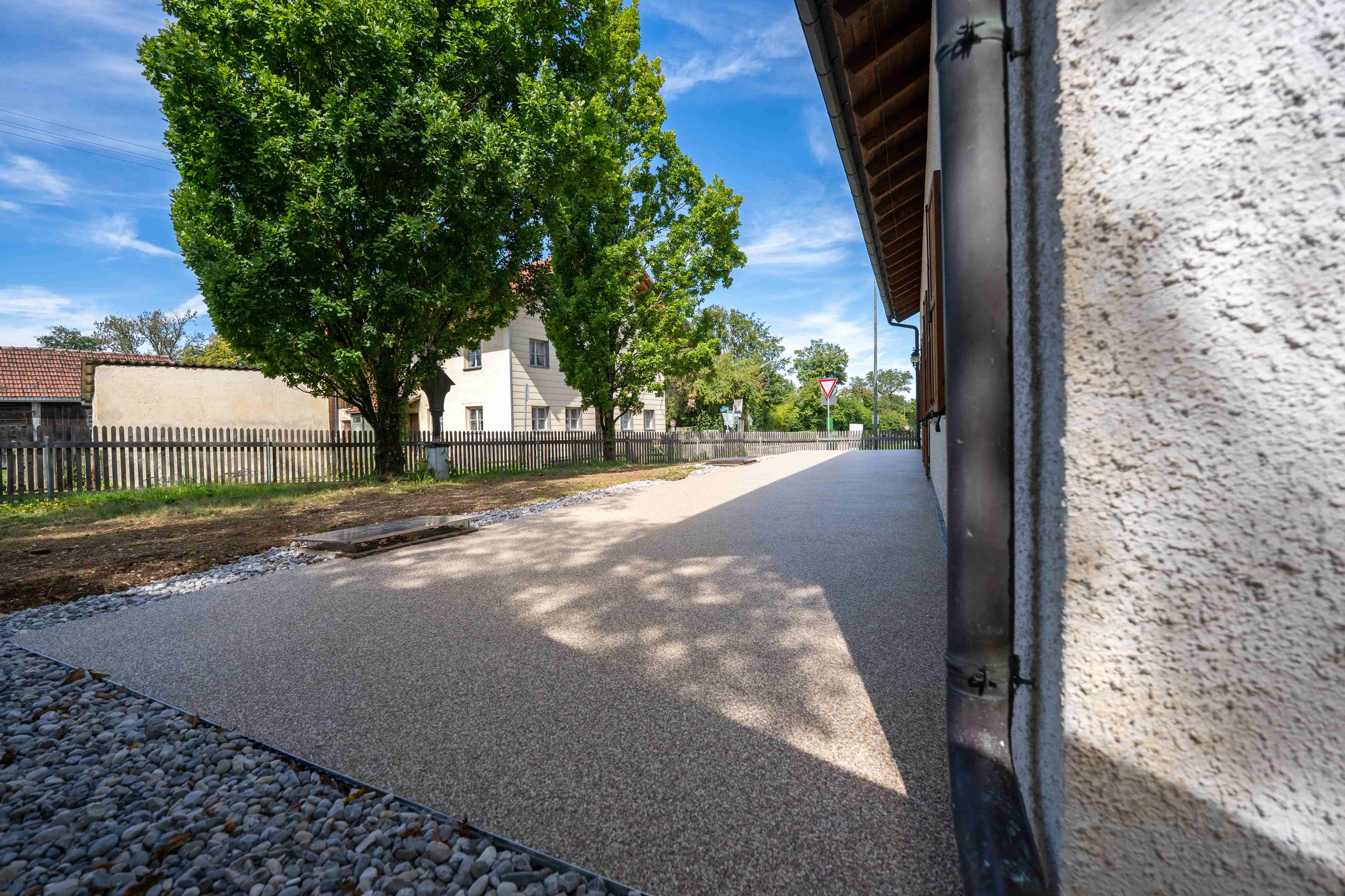 - Der Belag: Ein hochfester Steinchenteppich aus gerundeten Quarzkieseln wurde aufgebracht. Er ist extrem rutschhemmend und lässt Regenwasser sofort versickern.