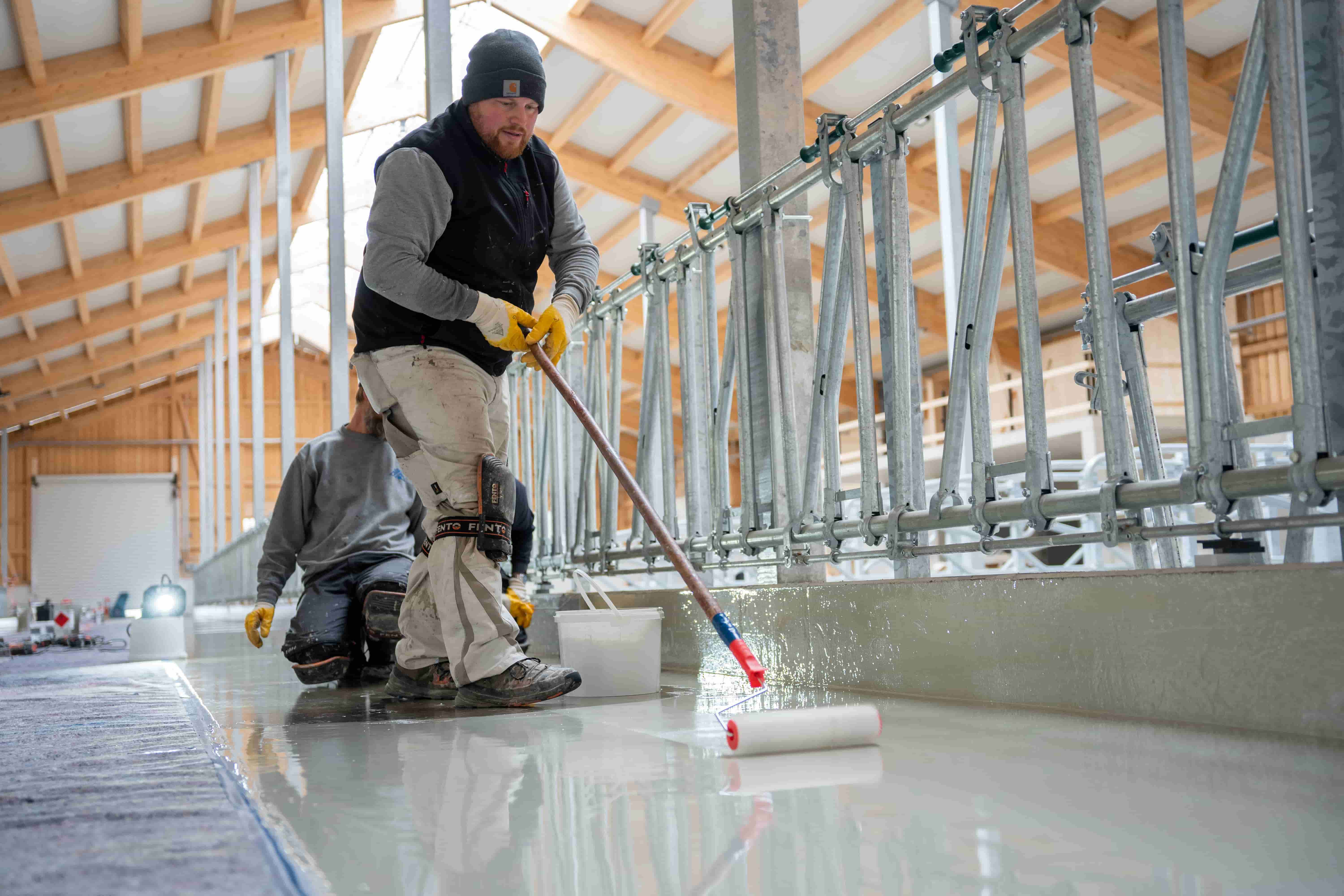 Der Einbau der Epoxidharzbeschichtung im Neubau des Kuhstalls folgte einem präzise durchdachten Ablauf, um spätere Schwachstellen im Keim zu ersticken.